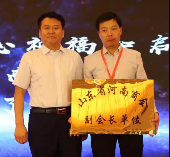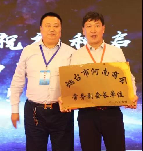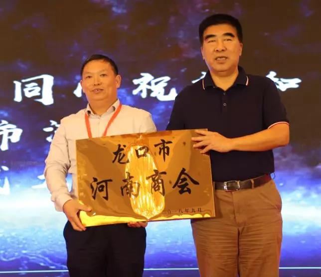 烟台市河南商会会长王德胜为龙口市河南商会颁发烟台市河南商会常务副会长单位牌,常务副会长李恒代表商会接牌。