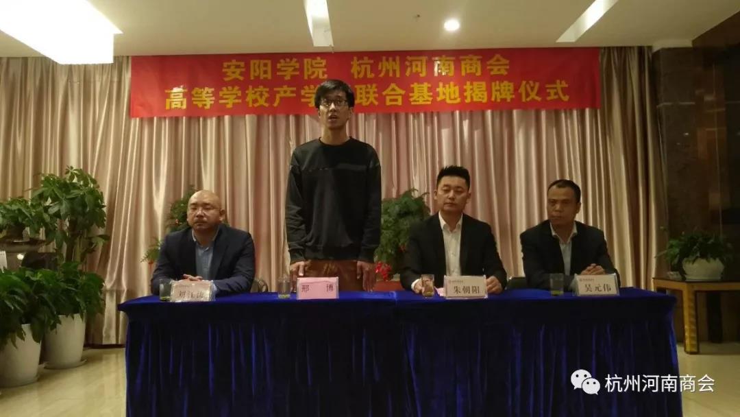 安阳学院老师代表邢博也简要介绍了学校的基本概况,感谢杭州杭州河南商会的热情接待,向双方的友好合作表示热烈的祝贺,有决心有信心在张道森院长的带领下,做好各项工作,为社会培养出更多的中流砥柱。