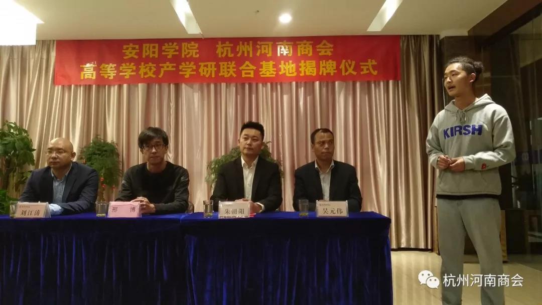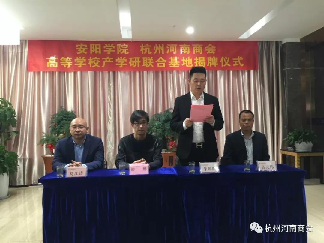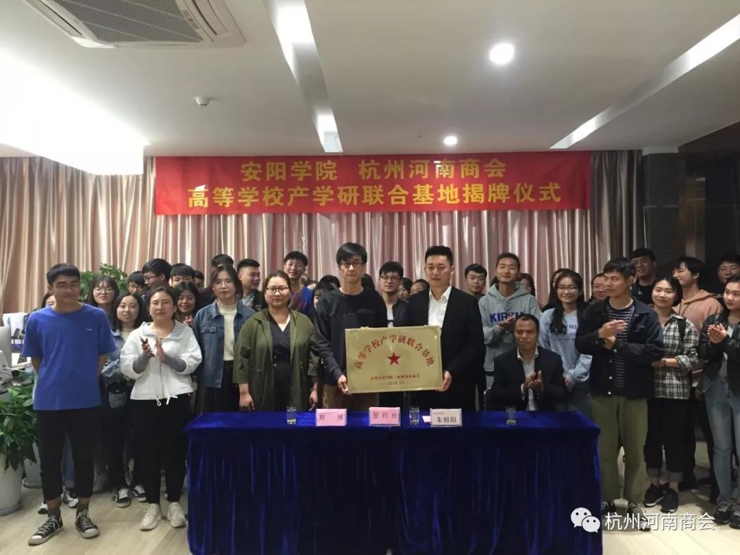 金秋送爽,丹桂飘香。10月25日上午,杭州河南商会、安阳学院“高等学校产学研联合基地”揭牌仪式在杭州河南商会举行。杭州河南商会会长朱朝阳、常务副会长吴元伟、副会长刘江涛、常务副秘书长郑贵甫、副秘书长许华伟,安阳学院老师邢博、李霄、王枭萌、张少楠及安阳学院学生120余人参加揭牌仪式。