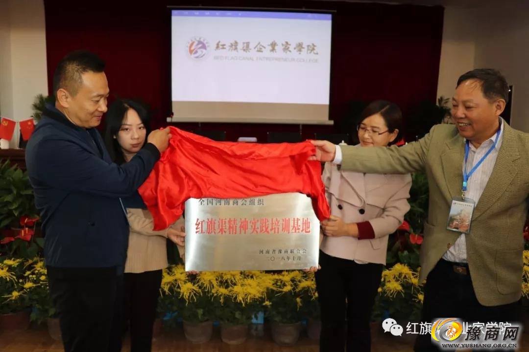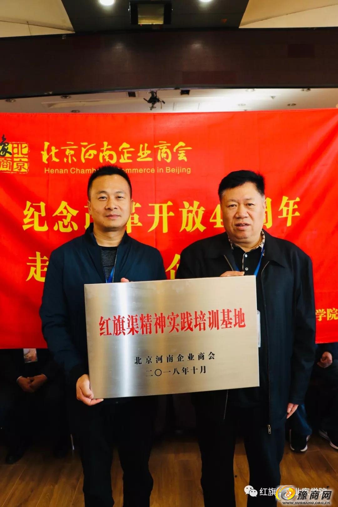 河南省豫商联合会秘书长张正林(右一)受省政协原副主席、河南省豫商联合会会长陈义初委托,向红旗渠企业家学院授牌。
