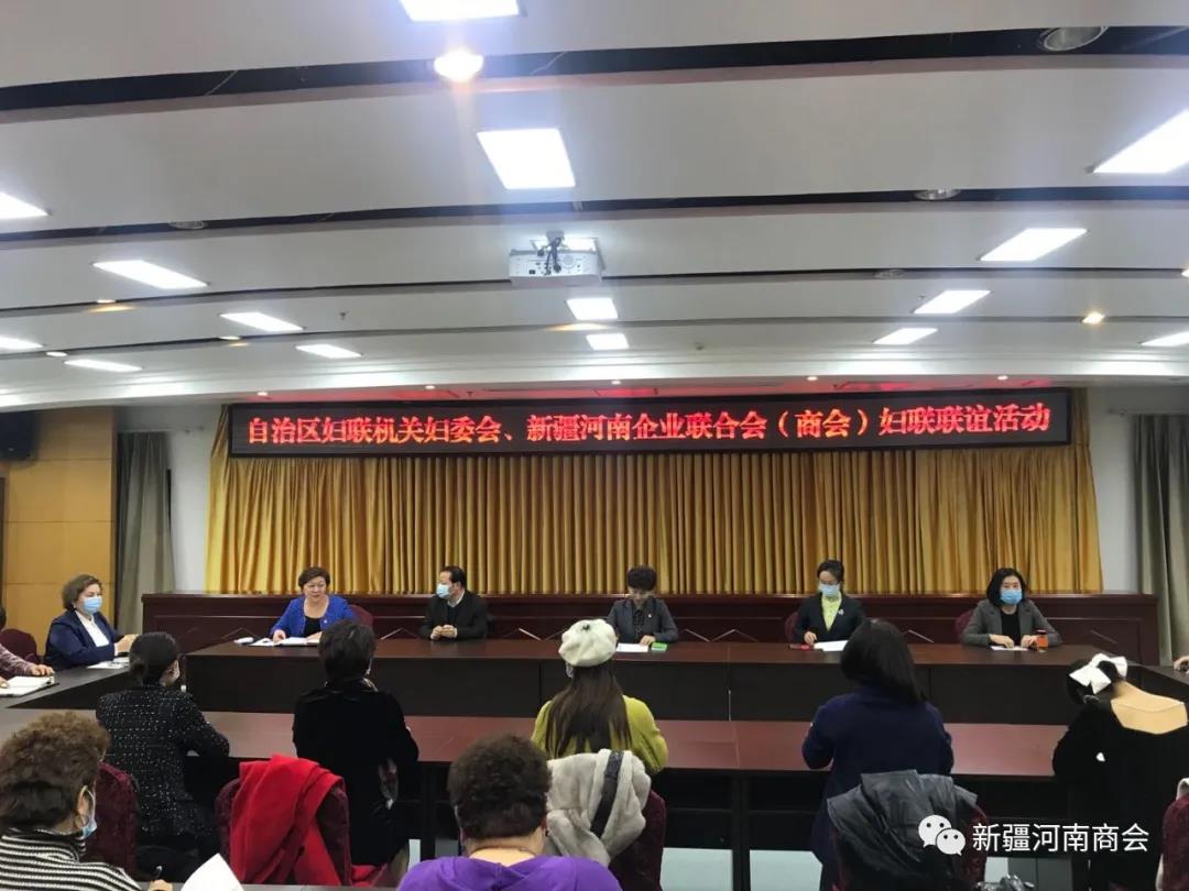 2020年11月18日下午,新疆河南商会妇联与自治区妇联机关妇委会联谊活动在自治区妇联举行。自治区妇联党组成员、副主席张莉英,自治区妇联二级巡视员马卫红等13名妇委会人员出席了此次会议。