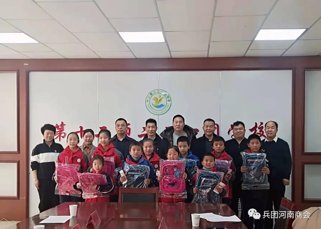 2022年1月5日,受申玉霞会长委托,新疆生产建设兵团河南商会一行,驱车200公里来到新疆生产建设兵团第12师221团学校,向该校学生捐赠了100套学习用品,并为其中10名困难学生每人捐助1000元助学金。