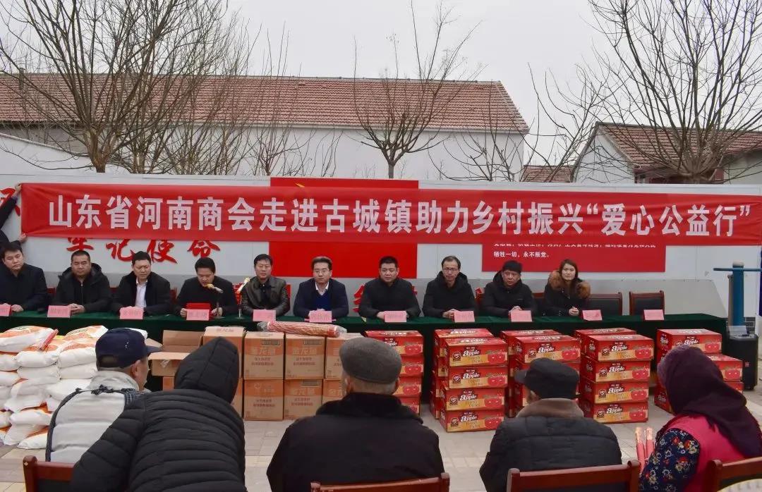 1月21日,山东省河南商会“豫鲁相通 情暖古城”爱心捐赠活动在滨州市沾化区古城镇郝家沟村成功举办。商会会员企业将购置来的米、面、油及灯笼、春联、棉服等生活物资,向古城镇高龄老人、脱贫享受政策群众进行爱心捐赠。商会执行会长朱继阳表示,孝老敬亲、扶危助困一直是我们民族的优良传统,也是河南商会一直当做事业来做的事情,今后商会将会继续加强对人民群众的关心关爱,营造全社会孝老敬亲、扶危助困的良好氛围,努力构建和谐幸福的美好社会。仪式结束后,商会一行还参观了当地村民自建的面条加工厂,自发购买了一批爱心面条,帮助群众提高产品知名度,打开产品销路。
